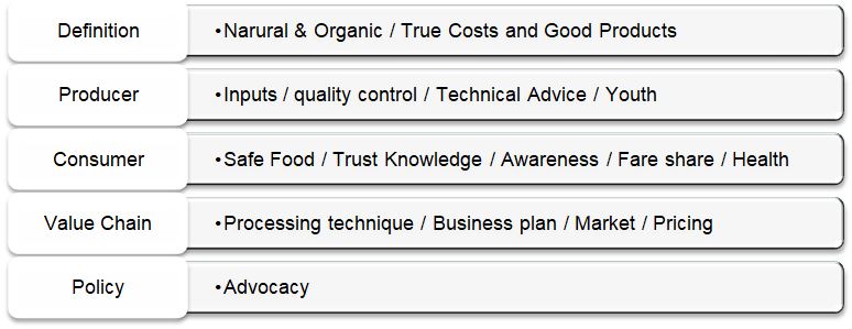 - Actively connecting to a range of networks in Myanmar to progress advocacy on related policy issues (e.g. consumers, seed, land, agro-ecology, etc.) that impact immensely on smallholder farmers and market participants. These networks are necessarily broader than just with other organic actors, in order to increase influence. The main engagement with government and private sector can be through these networks rather than as a TOA network. Connections should also utilise social media