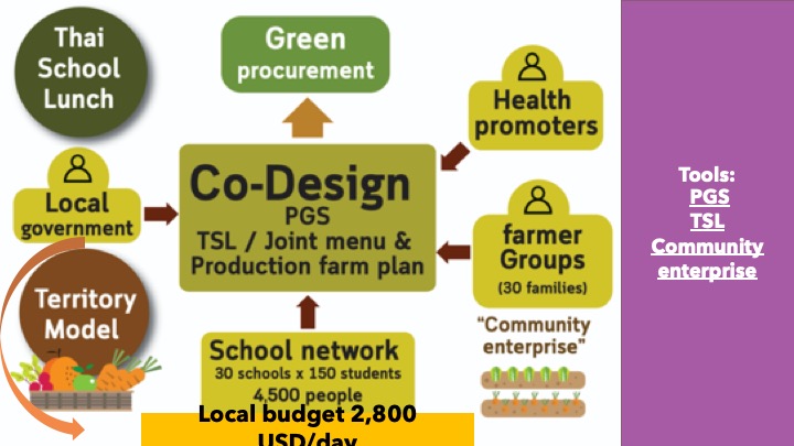 There are 3 tools enabling the success of the initiative: Participatory Guarantee System (PGS), TSL, and community enterprise. For local food economy, PGS certification is needed. TSL is the program that allows schools and farmers to discuss and cooperate on school menu and farm production plan. Community enterprise is necessary for farmers to register as a group because of the green procurement in Thailand. They are also organizing a weekly market to help farmers earn more income.
