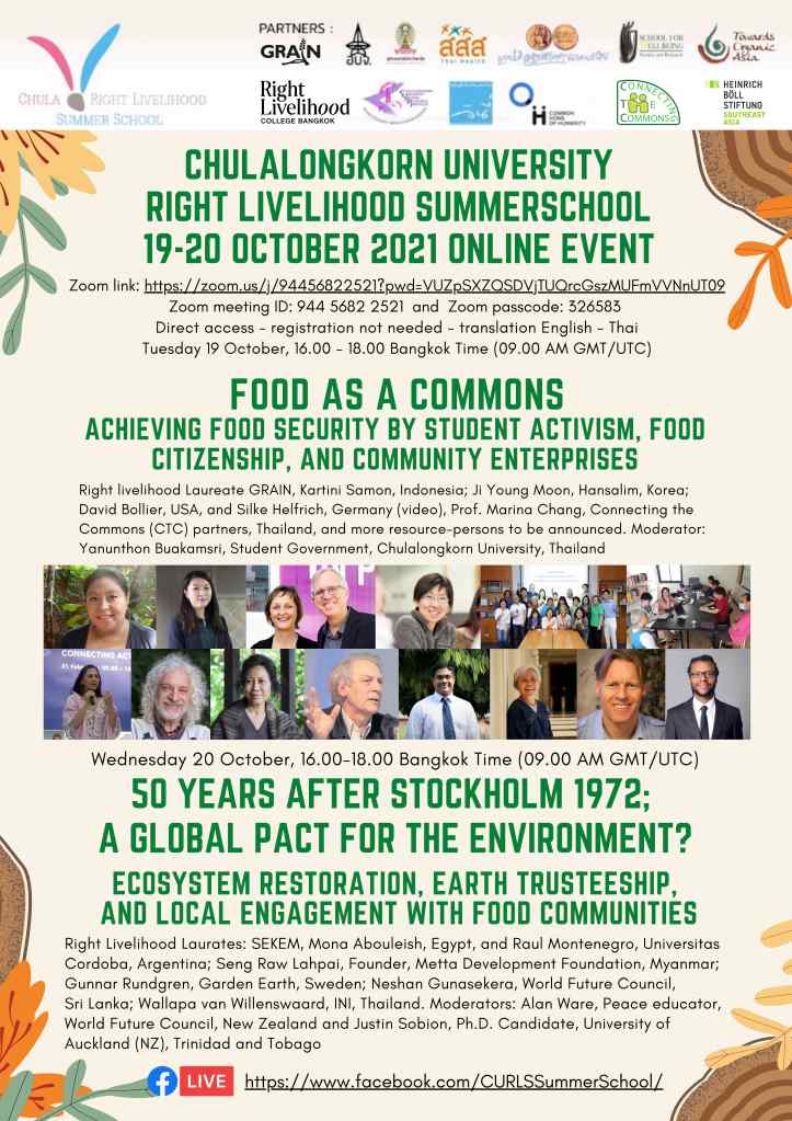 Organized by Chulalongkorn University Right Livelihood Summers School CURLS 2021 in partnership with: Right Livelihood College Bangkok ,Chula Students’ Council Executive Committee, Connecting the Commons (CTC), Innovation Network International (INI), Thai Health Food Program Project, Heinrich Böll Foundation Southeast Asia, Earth Trusteeship Working Group (ETWG), Navdanya International, New Zealand Center for Environmental Law, Common, Home of Humanity (CHH), Towards Organic Asia (TOA), CUSRI, and more.