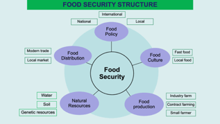 To understand the current situation of food, that the food productions- land, seeds, production process, price, and etc.- are under the control. Even though we planted on our land; are we really choose to do so? The variety of the plants/vegetable or the type of chicken, are we the one who choose what we want to eat? Then, food security structure can be categorised by five key components are food policy, food production, food distribution, food culture, and natural resources.